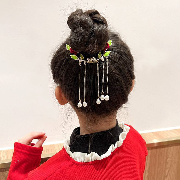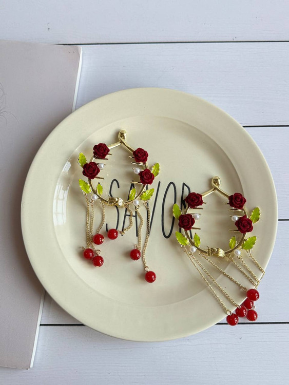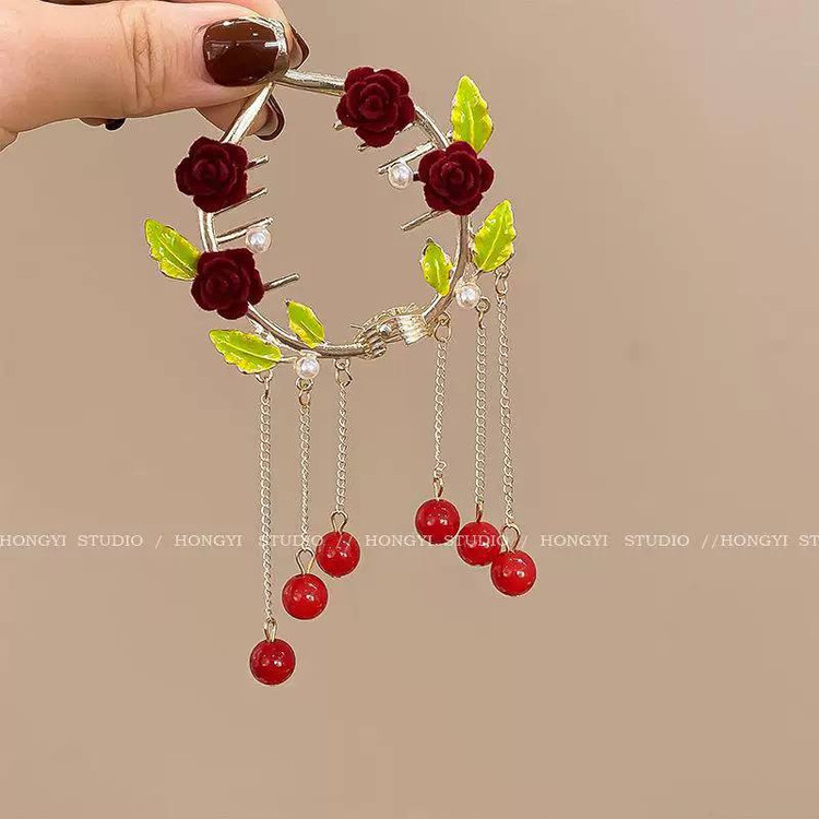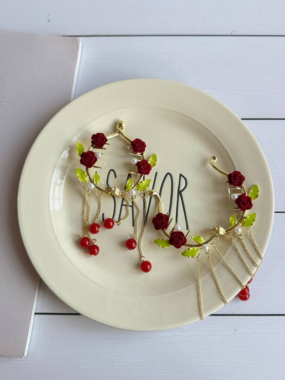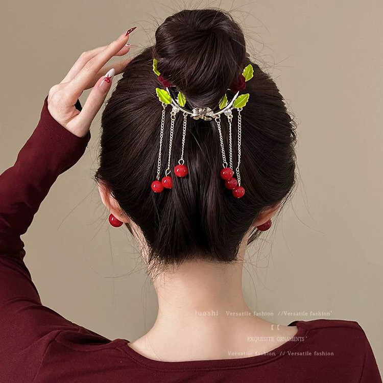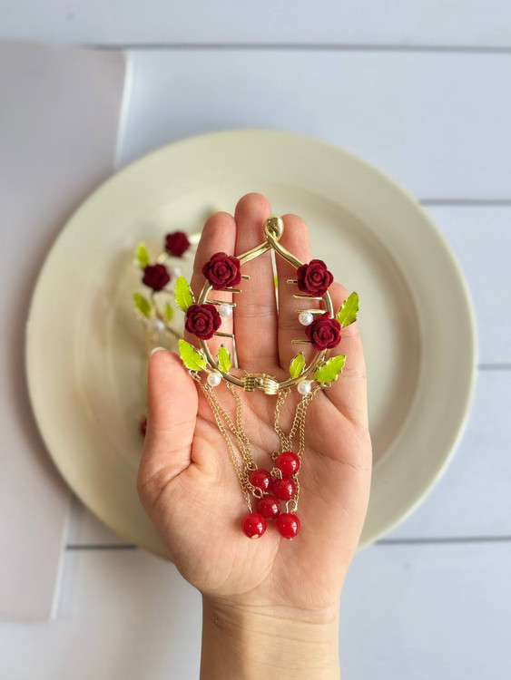 این اکسسوری شیک با طراحی خاص برگهای سبز و آویزهای زنجیری با مهرههای قرمز شبیه گیلاس، جلوهای خاص و چشمنواز به موهای شما میبخشد. مناسب برای مهمانیها، مناسبتهای خاص و استایلهای خاص دخترانه و زنانه.