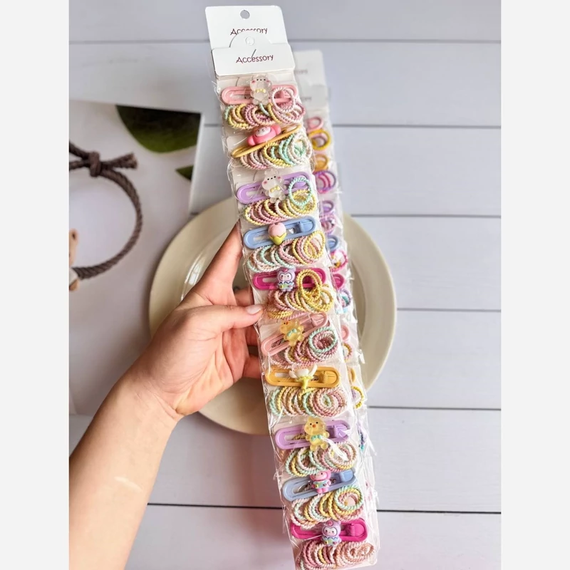 پک گیره و کش مو هربسته شامل : یک گیره انبری پیکسل دار +حدود 10عدد کش موی خارجی دررنگ های شاد و پاستیلی